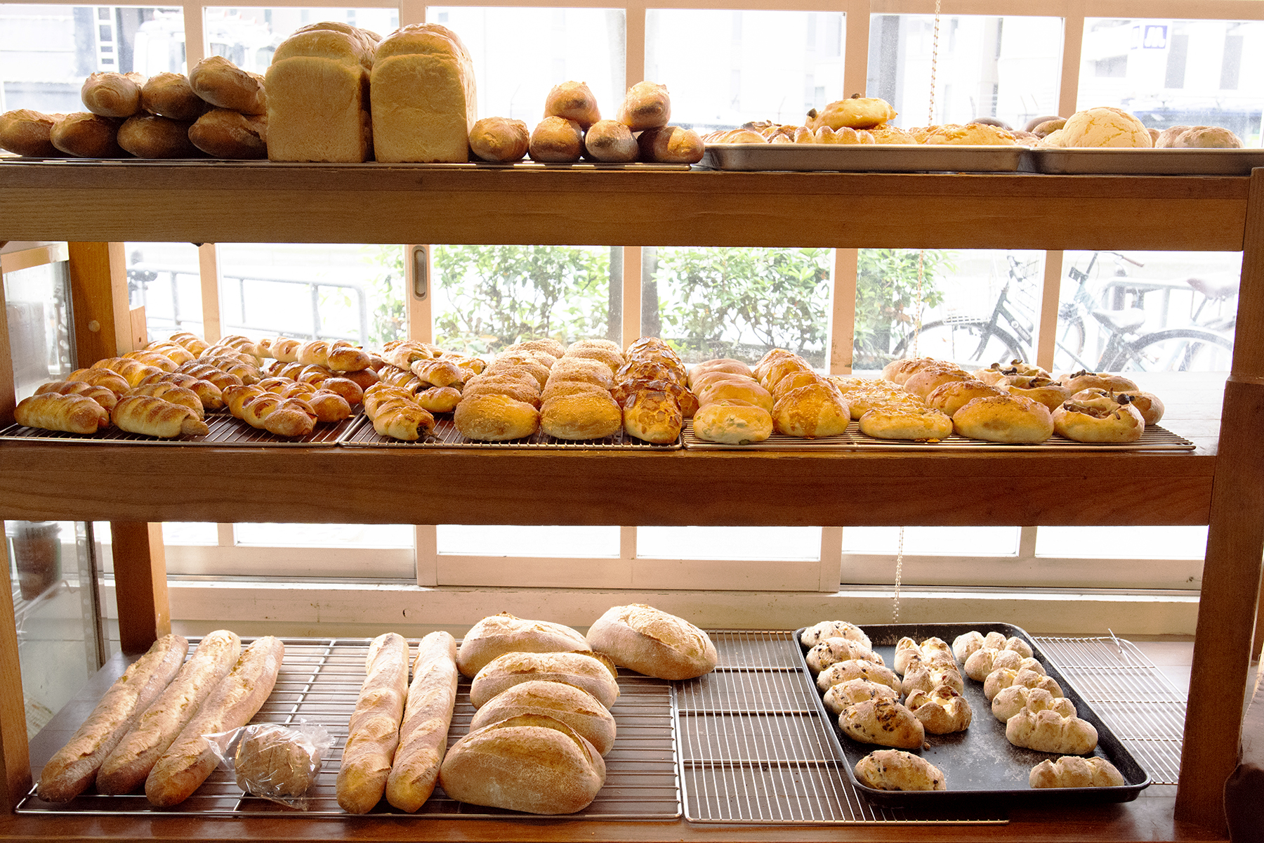 自家製の天然酵母を使用した、焼きたてのパンが所狭しと店内に並んでおります。